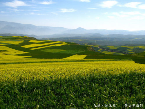 湟源县波航乡有个大山叫” 纯脑山”,海拔3500米,汽车从山下沿蜿蜒崎岖的土路爬到山顶需要30分钟,有很多胳脖肘弯.但这座大山却给我们呈现了一幅壮观风景画.黄灿灿的油菜花象从天而降的巨大绸布覆盖在起伏的山坡上,她比新疆昭苏的油菜花更有节奏,更有韵律,比婺源的油菜花更大气,更粗诓,油菜花,青稞,小麦很有层次地组成多彩的色块,形状有方形,圆形,椭圆行,不规律的曲线,纯脑山的高原山区的油菜花绝对是我看见的最为精彩的油菜花大片,我把我的当时的感觉告诉陪同的当地领导:波航乡除了要发展教育,还要发展油菜花观光旅游和自驾游,将来一定会火起来的.