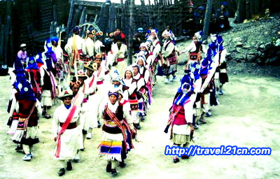 傈僳族青年男女谈情说爱,联系感情的方式大多借助于传统的唱歌对调方式。在傈僳族中流传着这样一句话:“没有一个好嗓子,休想找个好媳妇。”可见,唱歌对调在青年男女婚恋生活中多么重要。青年男女通过逢年过节、 参加婚礼、庆贺丰收、社会集会、生意往来以及串姑娘等活动,认识了对方,并产生了爱慕之心,就可以寻找机会与对方对歌。古老的求爱方式 傈僳族的求爱方式还有很多种。比如“江沙埋情人”就是傈僳族男女求爱最古老的方式之一。“盍什”节来临,福贡一带的傈僳族青年纷纷来到宽阔的怒江沙滩上,用口弦、琵琶 、“地里突”(竹笛子)等乐器伴奏起舞,交流 感情。三五成群,无拘无束,寻求配偶。 一旦心灵相通或者平时就已相识,愿结为伴侣,男青年便在沙滩上挖一坑,约上要好的几个同性伙伴,将意中人抬到沙坑里,用细沙埋在身上。之后,伙伴们迅速离去,男青年马上将沙土刨开,也就表达了自己的爱慕之情。别看姑娘们平时温柔娴静,而这时却泼辣大方,往往七八个人统一行动,用偷袭的办法又将男青年连拉带推地埋入沙坑,任凭男青年体魄强壮,也难逃这一情场闹剧。 “江沙埋情人”还包括射弩,男青年常以高超的射弩技术赢得姑娘的爱情。射弩场上,人们围成了半圆,争相观看爱情之箭的精彩表演。只见姑娘头顶一个盛满大米的木碗,米上放一只鸡蛋作靶子。男青年站在四五米外,不慌不忙,弩箭搭弦,瞄准发射。“嗖”的一声,顷刻,鸡蛋破裂,蛋汁飞溅。顿时,场上爆发出一片掌声。在这惊险的动作之中,一是显示男青年的射弩功夫,二是考验姑娘对男青年的诚意。 当然,有的男青年射弩没有把握,宁愿射不中鸡蛋,也不愿伤了心爱的人,只不过让人说不够勇敢强悍罢了,这并不影响他们结为伴侣。 射弩完毕,取闹的青年人便捧来竹筒酒(也称同心酒)让对对情人喝干,以定终身。人们边喝、边唱、边舞,沉浸在欢乐的气氛之中。 吹树叶是呼唤情侣或通知对方自己有事不能前往,傈僳语叫“师前木”。在参加婚礼的宴席上把双筷子交叉起来或倒置搁在碗上,筷子头表示幽会的方向。在公众场合则打暗号说今晚要到某村某寨赴约,其实就是通知情侣到哪里去幽会。 这些暗号都是以前的一些传统做法,现在随着男女交往的开放,已经不多了,但偶尔也有这样古老的暗号出现。